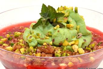 Aujourd’hui, je vous propose un tartare de fraises au balsamique, facile à préparer.Il est surmonté d’une légère crème à la pistache. Combinaison assez inhabituelle mais des plus délicieuses. Présenté dans des coupes (à martini de préférence), ce dessert est des plus chics.C’est une recette du jeune chef landais Julien Duboué, réalisée dans son restaurant parisien « A Noste » lors de l’After-work show organisé par Albal, pour nous présenter ses dernières nouveautés.Durant la soirée, Julien Duboué nous a fait déguster sa cuisine du Sud-Ouest revisitée et nous a fait cuisiner 2 recettes : ce tartare de fraises u balsamique et des bouchées landaises (recette à venir).Nous sommes repartis avec tous les ingrédients préparés sur place, emballés dans des sacs Zipper Albal (rien n’a coulé pendant le trajet, je vous le promets) afin de nous permettre de refaire la recette chez nous.Nous sommes en pleine saison des fraises, profitez-en.