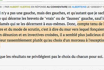 Donc pour Hubert, Manuel Valls, la déchéance de nationalité, la loi travail I, c'est aussi la gauche. Visiblement Hubert ne sait pas de quoi il parle, ou alors il brouille les cartes à dessein. De plus qui a demandé de choisir un morceau à l'exception de tous les autres