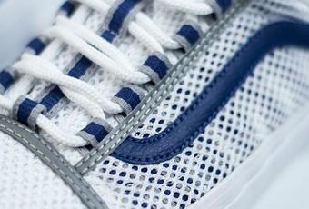Les labels de skate peuvent jouir d’une liberté sans limites qui attire les grandes marques en constante recherche d’une impertinence qui coûte cher dans ce milieu très normé. Certains auront reconnu l’inspiration derrière cette nouvelle Old Skool qui dispose d’une empeigne similaire à une certaine Spiridon symbolisée par ce maillage d’alvéole sur une construction en mesh qui laisse apparaître le système de maintien des lacets. Deux coloris sont au programme avec une paire disposant d’une empeigne blanche associée à des détails bleus tandis que la seconde offre une ascendance de bleu aux côtés d’un branding jaune.