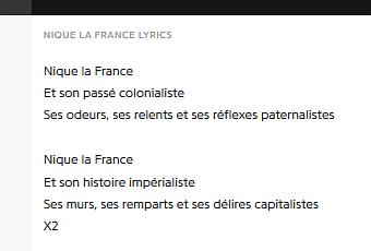 Dans une séquence d’une insistance immonde, 5 personnes ont cru bon de s’en prendre sur le plateau des grandes gueules sur RMC à une députée en l’obligeant avec une certaine virulence à dire « Vive la France » sous prétexte qu’elle avait signé il y a plusieurs années une pétition en soutien à ZEP (Zone d’Expression Populaire), pour une chanson que voici :