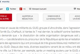 sourceJe souscris volontiers à cette demande, liée à cette violente agression évoquée ici. Il n’y a pas qu’à Nantes qu’on peut constater leurs innombrables exactions. Fort de la toute puissance et de l’ivresse (du sentiment d’impunité fort peu contrarié par un ministre de l’Intérieur bien conciliant à leur endroit ?) que leur impulse le score du FN à la présidentielle, et de leurs appuis notables au sein de ce parti d’extrême droite au plus haut niveau, il ne se passe pas une semaine sans que l’on assiste à l’une de leurs innombrables exactions : agressions, saccages de locaux, menaces de mort, tentatives d’intimidations diverses… Il me semble être fondé à qualifier leur logique – connaissant leur fonctionnement – de terrorisme d’extrême-droite. Aussi, je demande tranquillement dans mon coin, ne représentant que moi-même, la dissolution de cette entité fasciste violente qui manie la peur comme une arme politique d’intimidation de ses opposants.