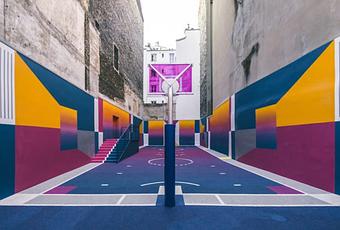 Depuis 2015, les amoureux de basketball et les enfants du quartier pouvaient s’entraîner sur un terrain de basket unique en son genre juste à côté de la dépendance basketball de la marque Pigalle. Le terrain s’habille cette saison d’une toute nouvelle parure encore une fois réalisée par Ill Studio qui s’est inspiré des pièces de la nouvelle collaboration entre Pigalle et Nike que nous vous présentions par ici. Une association de couleurs primaires avec la présence de différentes nuances de roses vers le violet habillent ainsi les formes géométriques brutes de ce terrain qui réussi encore une fois à faire le tour du monde.