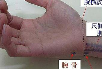 Sur le bord cubital du poignet, dans une dépression entre la base du cinquième métacarpien et l'os triquetrum.