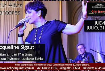 La chanteuse Jacqueline Sigaut se produira jeudi 6 juillet 2017, à 21h, à Ocho Esquinas, une salle qui propose des soirées musicales gratuites, subventionnées par une cave vinicole qui assure sa promotion en soutenant des chanteurs à Buenos Aires (Bodega Uxmal). Cela se passe dans le quartier de Colegiales, avenida Forest 1186.