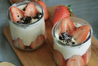Pour la décoration ajoutez une fraise coupez en deux et des oréos émiettez.