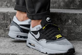 Les différents acteurs de la sneaker doivent rivaliser d’inventivité pour sortir du lot avec des collaborations qui sont désormais devenues banales sur le marché. Le magasin a ainsi mis au point une Air Max 1 inédite en accord avec une Smart également issue de cette collaboration proposant une ascendance de gris avec des notes de jaune. La Air Max 1 reprend donc ce thème de couleurs avec une association de noir et de gris sur son empeigne toute en Flyknit associée à une semelle également grise. La paire dispose également d’un branding inédit sur l’empiècement métallique situé sur la partie basse du système de lacet.