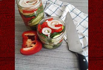 - 400g de petits concombres ou gros cornichons- 300ml de vinaigre blanc- 3 verres de sucre en poudre (des 20cl)- 1càc 1/2 de sel fin- 1/2 poivron rouge- 1 gros oignon blanc