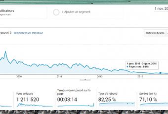 - La migration vers ConseilsMarketing.com (suite à de gros problèmes d’hébergement sur un petit hébergeur), avec 18 millions de pages vues entre novembre 2011 et juillet 2017, soit désormais environ 400 000 pages vues par mois (13 K / jour).