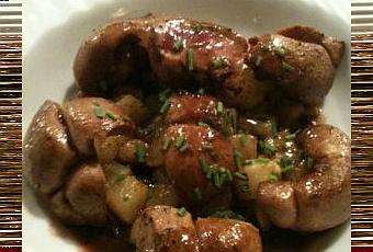 Dégraisser le rognon et le tailler en escalopes, les saisir rapidement dans un peu d’huile de noix, puis les éponger sur du papier absorbant.
