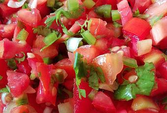 Coupez tous les tomates, l'oignon et le piment en petits cubes (5mm x 5mm x 5mm). Ciselez les coriandre et hachez très finement l'ail.