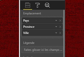 Afin de démontrer les nouvelles capacités des cartes géographiques de Power BI, nous utiliserons deux sources de données différentes. D’abord, nous utiliserons une table qui possède des ventes par ville, province et pays. Pour profiter des nouvelles capacités des cartes géographiques, il suffit de placer vos champs géographiques dans la zone Emplacement, dans un ordre hiérarchique.