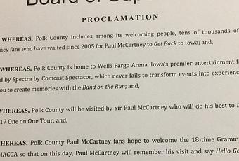 Le 21 juillet, Paul McCartney se produira dans la ville américaine de Des Moines. A cette occasion une attention toute particulière a été réservée à Paul : ce jour là sera décrété comme " Paul McCartney Day " : Paul ne devrait pas y être insensible !