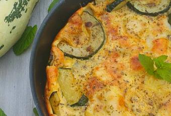 Dans un moule à manquer, dispose la poêlé de courgettes ainsi que les morceaux de bûchette de chèvre puis versez l'appareil oeuf, farine, lait.