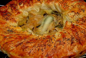 Cela fait un petit moment que je ne vous ai pas proposé de tarte salée.Celle d'aujourd'hui est à base de courgettes et d'oignons nouveaux confits, couverts de tranches de fromage de chèvre, le tout enveloppé dans une pâte feuilletée, elle-même façonnée façon rustique.Une recette très facile à réaliser avec un mélange de saveurs des plus agréables.La force du chèvre relève la saveur plutôt neutre de la courgette.Pour l'occasion, j'ai utilisé la brique Soignon, un fromage à la texture fine et fondante qui met en appétit et uniquement élaborée avec du lait de chèvre.On peut le déguster tel quel ou le cuisiner . Dans les 2 cas, il est très bon.Le façonnage de la tarte ne me permettant pas de cuisson à blanc, j'ai badigeonné le fond de la pâte de moutarde, car cette dernière va former une croûte qui empêchera les légumes d'humidifier la pâte.Assurez-vous à la fin de la cuisson que la tarte est dorée dessus/dessous. La suite de la recette : cliquez ici