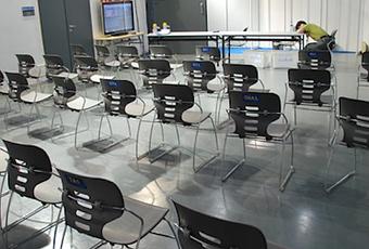 C’est l’endroit où les concurrents se retrouvent dans les vingt minutes qui précèdent la course. Même les entraîneurs n’y ont pas accès. Les nageurs décrivent une pièce aseptisée, une chaleur moite, un sol humide. Le décor : huit chaises, une par finaliste, et un écran au mur, sans son, qui diffuse les compétitions.