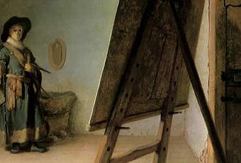 Sur le panneau de bois de modestes dimensions (25 x 31 cm), la pièce est presque vide. Un petit bonhomme porte une vieille robe de chambre, un large chapeau, de gros souliers. Des pinceaux à la main, il vient de prendre du recul et regarde sa toile posée sur un chevalet ; l’instant est à la méditation ; le châssis que l’on voit semble plus grand que lui. Contre toute attente, ce petit bonhomme, c’est Rembrandt dans son atelier ; il a 23 ans (1629, Museum of Fine Arts, Boston).