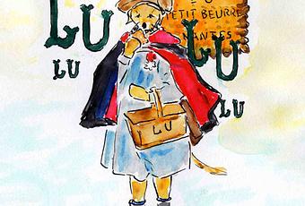 Quoi, vous n’avez jamais goûté un petit Lu ? Attention, si vous commencez, “Qui me croque, craque. Qui m’a croqué recroquera”, disait Louis Lefèvre-Utile son créateur… D’ailleurs, lors d’une campagne publicitaire intitulée “Lu et approuvé” (Jacques Hénocq, agence Bélier), on nous montrait un biscuit croqué à quatre endroits, avec le titre “Acte manqué”. Toujours est-il que le petit Lu a inspiré de nombreux dessinateurs parmi les plus grands : Loir, Cappiello, Rabier pour les anciens, Savignac, Gruau, Folon, Sempé, Topor plus récemment. Pour le fameux “Petit écolier” dont je m’inspire ici, c’est Michel, le fils de Firmin Bouisset l’auteur de l’affiche qui a servi de modèle. Pour moi, c’est mon fils Zéphyr. Son cachet ? Un paquet de petits Lu...