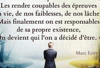 On peut blâmer son enfance, accuser indéfiniment ses parents de tous les maux qui nous accablent, les rendre coupables des épreuves de la vie, de nos faiblesses, de nos lâchetés mais, finalement, on est responsable de sa propre existence. On devient qui on a décidé d'être. - Marc Lévy