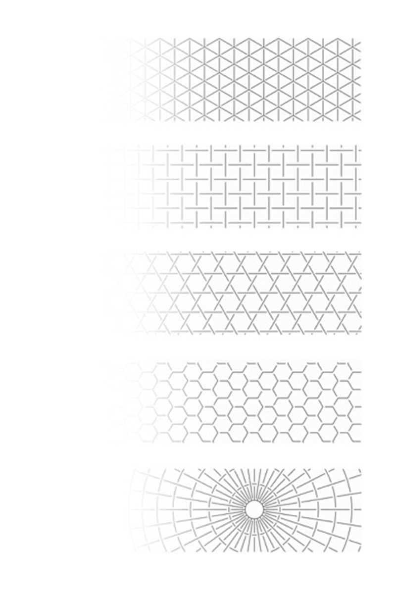5 types de pliages ont été utilisés pour créer différentes combinaisons convexes : le triangle, le carré, l’hexagone, le triangle+hexagone et le carré2, . La surface convexe s’intègre parfaitement aux fissures géométriques créant une nouvelle transformation.