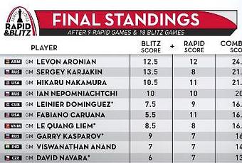 Gros suspense dans la seconde journée de Blitz. Le Russe Sergey Karjakin lancé tel un spoutnik la veille avec 8 points sur 9, faiblit en fin de parcours pour rendre une carte totale de 13,5 points sur 18. Garry Kasparov fait le spectacle et aligne deux victoires de rang face à deux membres de l'équipe olympique des USA, Caruana et Nakamura, ce qui fait les affaires d'Aronian en tête. L'Arménien, en forme, marque 6 points sur 9 et remporte le combiné.