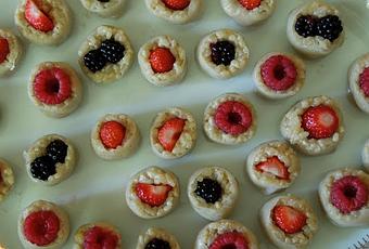 Tremper des galettes de riz dans de l'eau froide, disposer une belle cuillère à soupe de riz au lait sur la galette et la rouler puis la trancher en makis. Enfoncer les fruits au coeur des makis en variant les parfums.