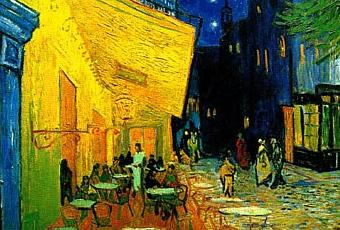 Et une touche de bleu et jaune avec ce tableau de Van Gogh, Terrasse de café le soir.