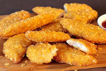 Tremper chaque aiguillette dans l'oeuf puis dans le mélange corn flakes noisettes.