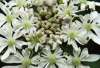 Heracleum sphondylium (Berce spondyle) : herbacée vivace très variable ; tige robuste cannelée, creuse, couverte de poils raides ; feuilles à 3-7 grandes folioles de forme très variable, pubescentes et blanchâtres sur leur face inférieure, gaines ventrues hérissées ; inflorescence en ombelle à 15-40 rayons, fleurs blanches, pétales bifides, les extérieurs plus grands ; fruits glabres, ailés, au sommet légèrement déprimé.