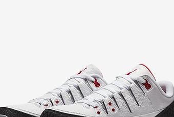Ce n’est pas la première fois que la ligne tennis rencontre Jordan Brand. Déjà en 2014, Roger Federrer et Michael Jordan s’asseyaient autour d’une table pour présenter une Zoom Vapor à l’occasion de l’US Open. Vous aurez deviné les inspirations qui ont conduit à la création de cette paire présentant une empeigne en cuir blanche associée à des panels Cement Black au niveau de son talon et de sa toe box. On retrouve un imposant branding Nike Air au niveau du talon de la chaussure ainsi qu’un discret RF sur sa midsole.