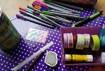 A la maison j’ai des feutres de tailles et de couleurs différentes (pas de marque je les ai acheté lors des rentrées scolaires en supermarché), une règle de poche (que je peux aussi prendre dans ma trousse quand je suis en voyage), des marque-pages autocollants, un crayon à papier, une gomme, de la colle, des scotchs décoratifs, du blanc et un taille crayons si je prend mes crayons de couleur.