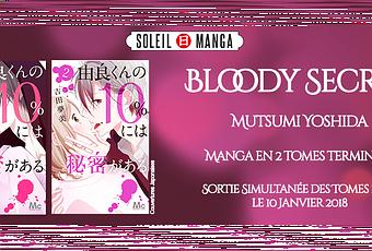 Soleil Manga annonce l’arrivée à son catalogue du shôjo manga Bloody Secret (Yura-kun no 10% ni wa Himitsu ga Aru) de Mutsumi YOSHIDA. Pré-publié en 2016 dans le magazine Margaret des éditions Shueisha, le titre s’est terminé avec la parution de son second volume relié. Les deux tomes version française de Bloody Secret paraîtront simultanément le 10 janvier …