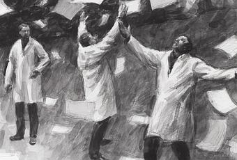L’iconographie corrobore l’idée que nous sommes dans un univers de signes, les livres jetés au sol, les feuilles de papier vierges que déchiffrent des laborantins catatoniques, les rapports d’échelle selon des valeurs non pas visuelles mais « ontologiques » dont nous n’avons pas la clé, etc. tout ceci suppose des relations de sens, de glissement sémiotiques plus ou moins surréalistes. D’autant plus que ces individus semblables qui s’agitent sur la toile se livrent tous à la même activité: ils étudient, analysent, auscultent, observent, décryptent, déchiffrent. Quant à nous, l’observateur/regardeur, nous savons que toute cette agitation est vaine, c’est le dernier tour de passe-passe du peintre qui nous inclue dans le jeu pour en pointer la viduité tout en nous laissant dans la perplexité complète sur la signification de ce numéro de cirque.