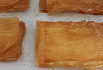 Pendant que les poivrons grillent, découpez plusieurs rectangles dans la pâte filo, passez du beurre fondu sur chaque rectangle et empilez les les uns sur les autres, (environ 4 à 6 pour chaque part). Ensuite enfournez pour 10 à 15 minutes à 200°. Laissez refroidir.