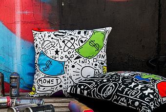 Cinq artistes, Jisbar - Kofi - Malpegados - Papa Mesk - Stew, finement sélectionnés par STREET ART UP, ont été appelés pour réaliser des créations originales sur coussins, un support peu banal pour ces artistes issus pour la plupart du monde du streetart ! Diverses tailles sont proposées : 40*40cm (66€), 60*60cm (94€), 100*140cm (295€).