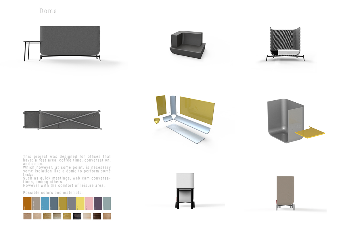 Micael a réalisé ce projet, Dome, au cours de son Master de Design Industriel pour une maison d’édition de mobilier. Le sujet consistait à réaliser un meuble aux caractéristiques paramétriques. Au cours de sa phase de recherche et d’inspiration, le projet s’est tourné vers un canapé, un style de design scandinave et les salons publics. En rassemblant les éléments sélectionnés, Micael a dégagé la problématique suivante: « Comment, dans un espace commun de détente, un travailleur peut-il se concentrer sur ses tâches personnelles ou confidentielles telles que réunions rapides, conversations Facetime? »