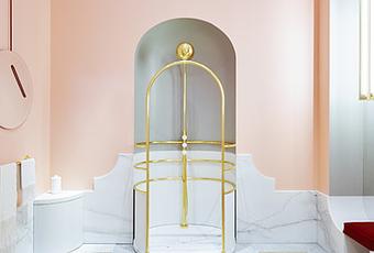 Les pièces de métal, traitées comme un bijou, sont dorées à l’or fin. Il en est de même pour la structure de la douche en arceaux, un modèle inspiré au créateur par une étonnante archive de Jacob Delafon. Une collection installé dans une mise en scène qui mêle le style gréco-romain et le savoir-vivre des palaces dans une approche douce et féminine.