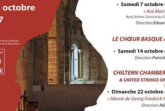- Dimanche 22 octobre à 17 heures : Messie de Georg Friedrich HAENDEL par le CHILTERN CHAMBER CHOIR (Angleterre), Direction Adrian Davis avec l'UNITED STRINGS OF EUROPE (Londres), premier violon Julian Azkoul, renforcé de musiciens régionaux réunis par Franck Fontcouberte (Montpellier-Sète).