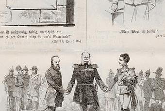 Cette page illustrée des Fliegende Blätter est organisée comme la mise en scène d'une pièce de théâtre avec pour protagonistes le roi de Bavière, Bismarck et l'empereur Guillaume Ier. Les répliques reproduites sous les vignettes sont extraites, non sans humour et ironie, de la pièce Die Jungfrau von Orleans. Eine romantische Tragödie (La pucelle d'Orléans, une tragédie romantique) que Schiller écrivit en 1801. Jeanne d'Arc qui prête ses répliques aux Allemands victorieux.