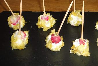 Piquez un petit bâton dans chaque radis et trempez-les dans le fromage frais pour bien les enrober.