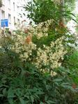 Les bambous sacrés (Nandina domestica) sont en pleine floraison. De grands panicules de petites fleurs crèmes se dressent au-dessus du feuillage fin et élégant.