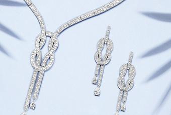 Le collier se fait lasso délicat, sa corde pavée de diamants coulant jusqu'au creux du cou et se terminant par deux diamants poires.