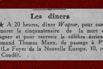 C'est sous les auspices du Pen-Club que M. Thomas Mann a parlé de Richard Wagner, s'attachant à situer dans son époque le génie du maître de Bayreuth, " un complexe dans lequel s'ajoute à la musique le besoin de créer des mythes, le goût et le sens de la psychologie, et qui force à admettre cette constatation : qu'il se compose de dilettantismes divers ". Le succès fait, à cette brillante conférence alla aussi à ce grand écrivain, artisan persévérant du rapprochement franco-allemand et dont M. Louis Piérard, président du Pen-Club salua l'idéal européen. [...]"