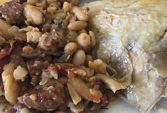 Saler et poivrer l’intérieur du poulet puis le farcir avec les haricots.
