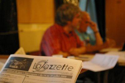 Voici en image la Jazzette annonceurs et, en arrière-plan, Bob (chef-chef) et Yannick (chef) font le point sur: les partenariats, France 3 (vive la télé publique!), la randojazz, les différentes conventions, les pavés, La Dépêche du Midi, les expos, la distribution des photos dans les commerces, des éventuels gobelets imprimés (pas pour cette année), les dates de l'édition 2009, Histoires d'éloges, les bénévoles qui seront présents cet été, les transports, l'hébergement, la sono du podium Verninhac, la boutique du festival, la buvette, la manutention, qui suit le off? (on manque de bénévoles!), les repas (tous les jardiniers amateurs peuvent amener leurs légumes), réunion le 05 juillet, le 14 juillet à 16h., le 15 juillet à 10h.30, les badges, la première Jazzette, la table ronde et un raton laveur. C'était, en vrac et dans le désordre, l'avant-dernière réunion avant le début du festival 2008.Gilles