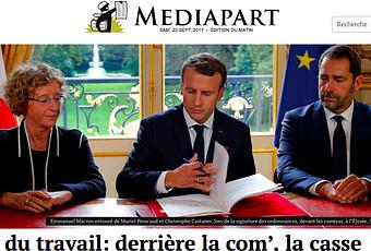 Fidèle à son habitude de double language (je suis de gauche mais en fait de droite), Mediapart dénonce le gouvernement, en nous expliquant qu'il fait de la com' et de la casse. Les pourris ! Mais Mediapart fait exactement la même chose en plaçant cette belle et grande image de macron et sa clique en Une le 23 septembre 2017. Car cette Une participe à la mise en scène valorisante du gouvernement, en nous le présentant sur un équivalent de papier glacé. Et si Mediapart avait choisi la photo d'une victime de cette loi ?