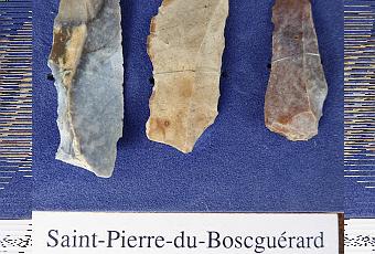 gauche à droite) : une lame à dos et cran adjacent, une pointe à dos et cran adjacent,