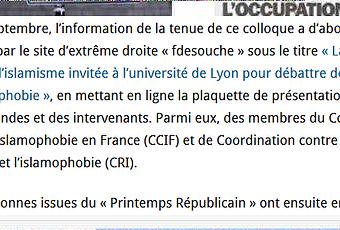 « Laïcophobe » ? Hem, hem, tu m’en diras tant. Sont-ce les mêmes inventeurs de concepts creux qui ont créé l’escroquerie intellectuelle qu’est le racisme anti-blanc ? Un groupe de personnes politiquement très orientées, à l’instar de l’inénarrable Bouvet, (dont on sait tous les penchants peu glorieux envers une personnalité peu suspecte d’antiracisme et pour cause), qui se revendiquent d’un combat pour la laïcité (à géométrie tout aussi variable que celle de l’extrême droite, que l’intégrisme catholique ou/et pédophile dérange bien moins), peuvent donc censurer un colloque universitaire sans que quiconque ne s’en émeuve ? J’ai honte de ce pays et de son incroyable inversion de valeurs qui voit jeter à la vindicte populaire ceux qui entendent sincèrement lutter contre le racisme, alors qu’ils laissent sans le moindre remord les fascistes parader en paix, partout dans le pays. Mais le débat n’aura pas lieu. Certains intérêts politiques sont visiblement en jeu qui n’y ont pas intérêt.