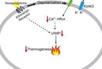 La stimulation adrénergique stimule la mobilisation des lipides et leur oxydation dans les adipocytes bruns et beiges, où l’énergie ainsi maîtrisée est dissipée en chaleur par un processus appelé thermogénèse adaptative. Les cascades de régulation ainsi que les voies de signalisation dissipatrices d’énergie qui facilitent la thermogénèse ont été largement décrites; on en sait toutefois assez peu sur les mécanismes de contre régulation négative. Ici, nous identifions un canal potassique à deux domaines pores nommé KCNK3, comme rhéostat intégré de régulation négative de la thermogénèse. Kcnk3 est transcriptionnellement raccordé au programme de thermogénèse par PRDM16, un régulateur majeur de la thermogénèse. KCNK3 exerce un effet antagoniste sur la dépolarisation membranaire induite par la noradrénaline par la stimulation de l’efflux de potassium dans les adipocytes bruns. Cela limite l’influx de calcium à travers les canaux calciques voltage-dépendants et freine la signalisation adrénergique, diminuant ce faisant la lipolyse et la respiration thermogénique. Les souris kock-out Kcnk3 tissu adipeux-spécifique présentent une dépense énergétique et sont résistantes à l’hypothermie et à l’obésité. Ces résultats dévoilent un axe de signalisation K+-Ca+crucial qui agit en freinant la thermogénèse, en maintenant l’homéostasie des tissus, et en révélant un mécanisme de régulation électrophysiologique de l’adipocyte. Yi Chen, et al, dans Cell, publication en ligne an avant-première, 5 octobre 2017Source iconographique, légendaire et rédactionnelle : Science Direct / Traduction et adaptation : NZ