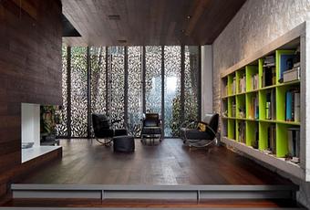 Cette maison est conçue comme une structure arborescente ou comme un escalier : la cage est délimitée par les murs des immeubles mitoyens. Le noyau contient les pièces humides, les emmarchements et les paliers forment des espaces de vie différenciés (home cinéma, entrée-cuisine-séjour, bureau, dressing-chambre, terrasse). La façade sud, entièrement vitrée et protégée par des persiennes, laisse entrevoir la complexité volumétrique et la continuité des espaces intérieurs. Le choix des matériaux renforce l'idée architecturale : les parois du noyau central se fondent avec les surfaces et sous faces des plateaux en acacia.