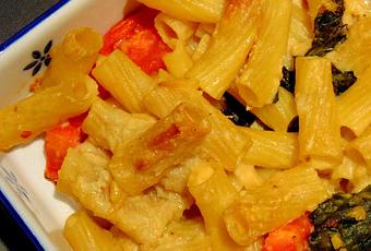 Une fois les pâtes cuites, on conserve plus ou moins une tasse de l'eau de cuisson qu'on j'ajoute à l'ensemble, et on mélange les dites pâtes avec